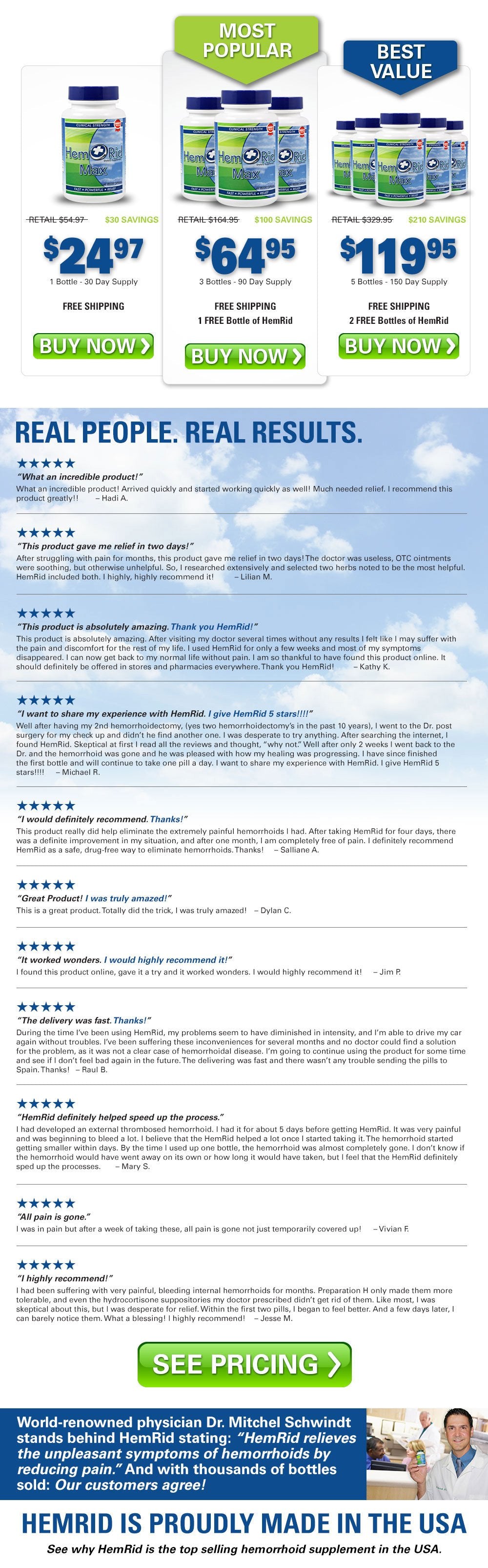 World-renowned physician Dr. Mitchel Schwindt stands behind HemRid stating: "HemRid relieves the unpleasant symptoms of hemorrhoids by reducing pain." And with thousands of bottles sold: Our customers agree!